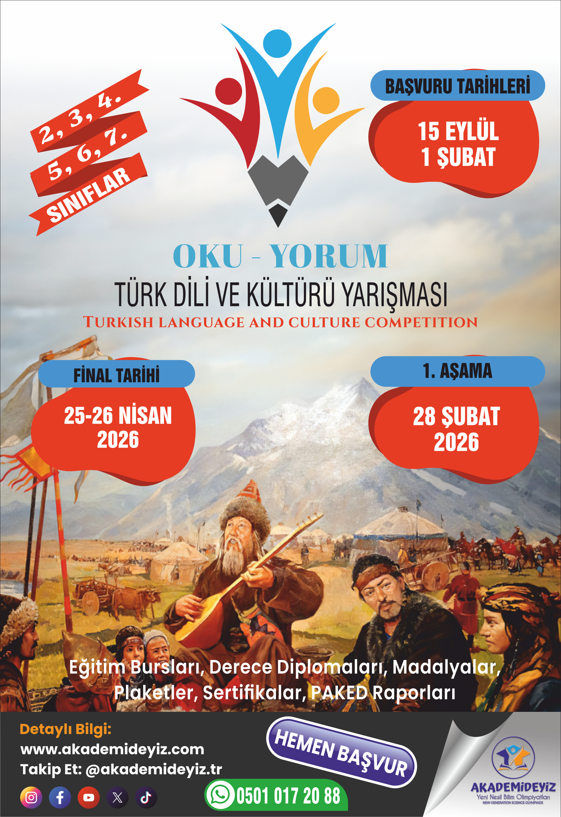 OKU-YORUM Türk Dili ve Kültürü Yarışması, öğrencilerimizin dilimize ve kültürümüze olan ilgisini arttırmak amacıyla hazırlanan bir yarışmadır. Türkçenin zenginliğini aynı zamanda Türk kültürünün güzellikleri içerisinde harmanlayarak sunan bir yarışmadır. Türkçe dersinin sınavlardaki net ortalamalarının günden güne düştüğü ve kültürel yozlaşmanın medeniyetleri esir aldığı bir dönemde OKU-YORUM Türk Dili ve Kültürü Yarışması’nın öğrencilerimize fayda sağlayacağı alanındaki uzman eğitimciler tarafından vurgulanmaktadır. 2, 3 ve 4. sınıflar ile 5,6 ve 7. Sınıflarda okuyan öğrencilerimiz katılabilir. Özel okullar, devlet okulları ve dershanelerde eğitim gören öğrenciler yarışmalara katılabilir.