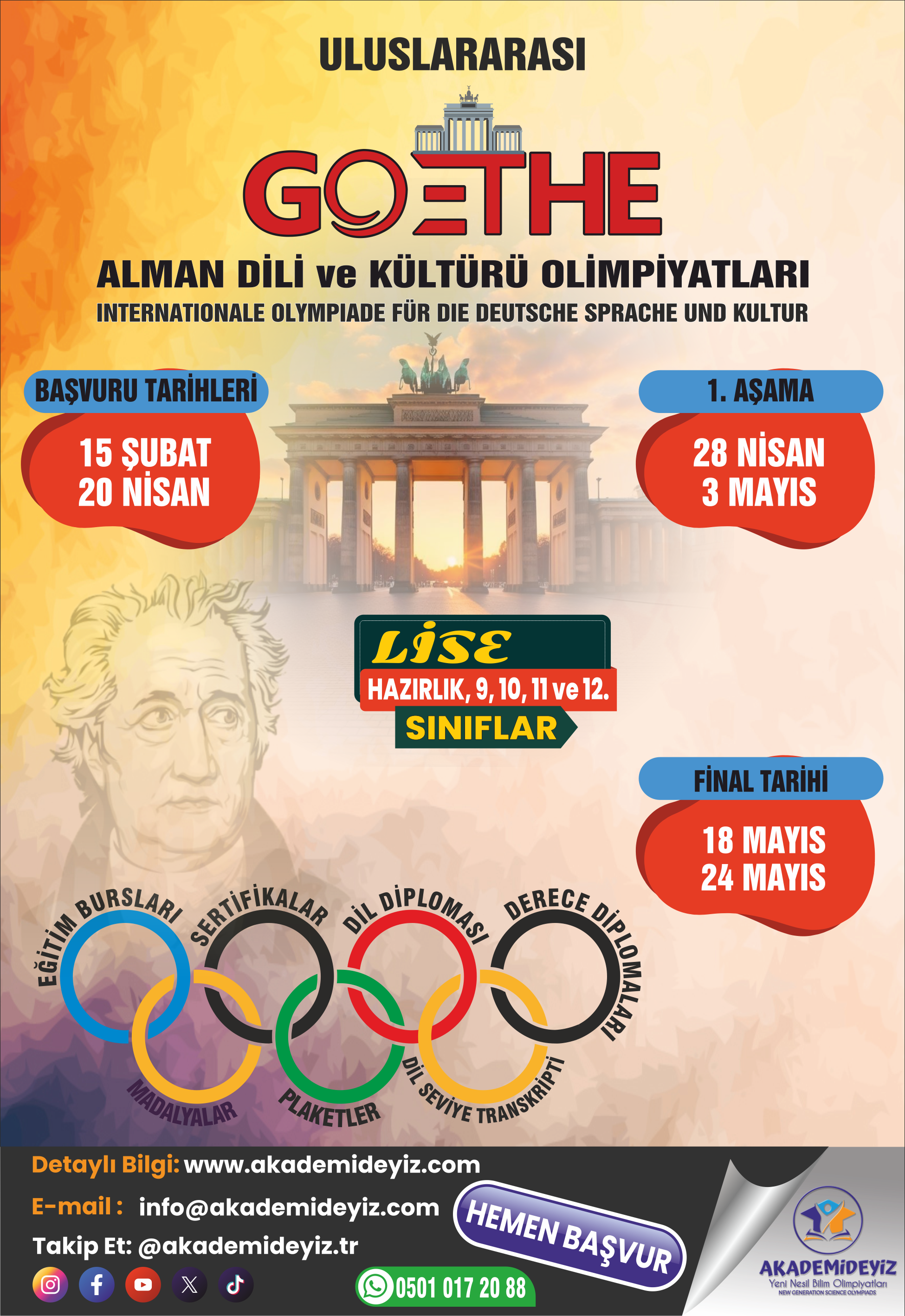 GOETHE Almanca Dil ve Kültür Olimpiyatı, öğrencilerin Almanca dil becerilerini geliştirmelerini ve Almanca konuşulan kültürleri anlamalarını teşvik etmek amacıyla düzenlenir. Bu olimpiyat, öğrencilerin okuma, yazma, dinleme ve konuşma becerilerini geliştirmelerine yardımcı olur ve kültürel farkındalık kazandırır.